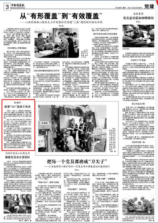 该矿“433”思政工作法中的“433”分别指“4送”“3进”“3多”。“4送”为矿领导送暖心、机关部门送关心、科区送爱心、班组送贴心,“3进”指党支部书记进班组、进公寓、进心里,“3多”指多了解、多帮助、多服务。