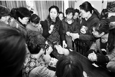 2月29日,在安徽淮北矿业集团淮北选煤厂社区中心内,保育专家正在为该厂离岗、内退女工讲解新生儿护理知识。面对煤炭市场下行压力,淮北选煤厂一些技术含量低、收入少的女工提前离开岗位。该厂工会积极为她们搭建创业就业学习平台,开展了“学创业技能,做转型职工”月嫂培训活动。韩晓兵 摄