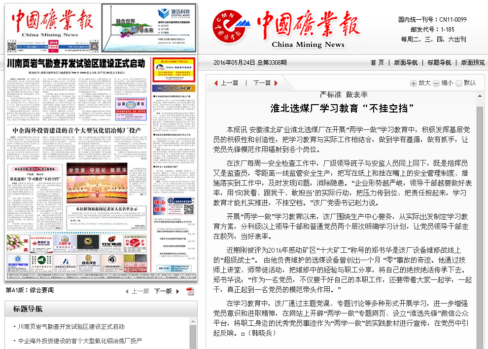 中国矿业报1版:淮北选煤厂学习教育“不挂空挡”