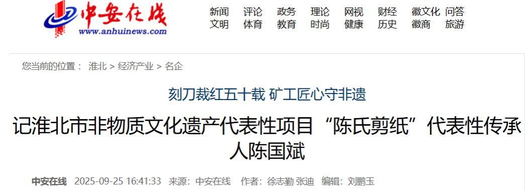 9月23日中午,淮北矿业集团临涣选煤厂的机械轰鸣声中,简单整洁的剪纸工作室里却静得出奇。57岁的陈国斌正俯身案前,右手紧握刻刀在红纸上游走,纸屑如红蝶簌簌落下。