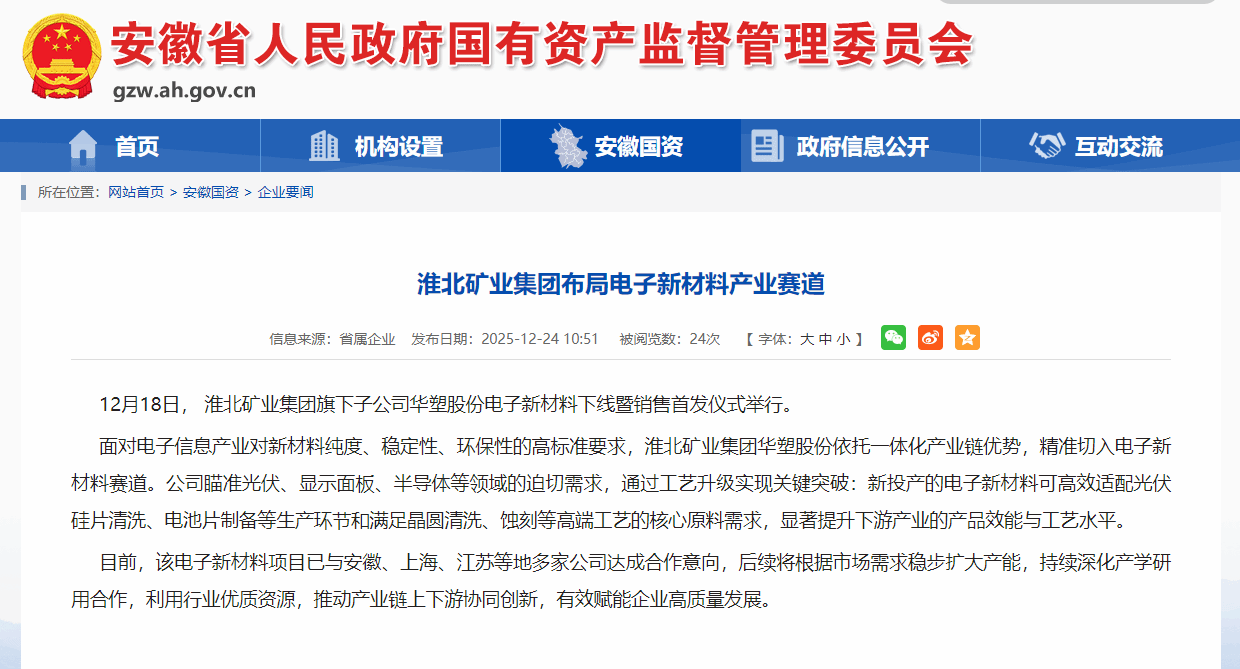 12月18日, 淮北矿业集团旗下子公司华塑股份电子新材料下线暨销售首发仪式举行。