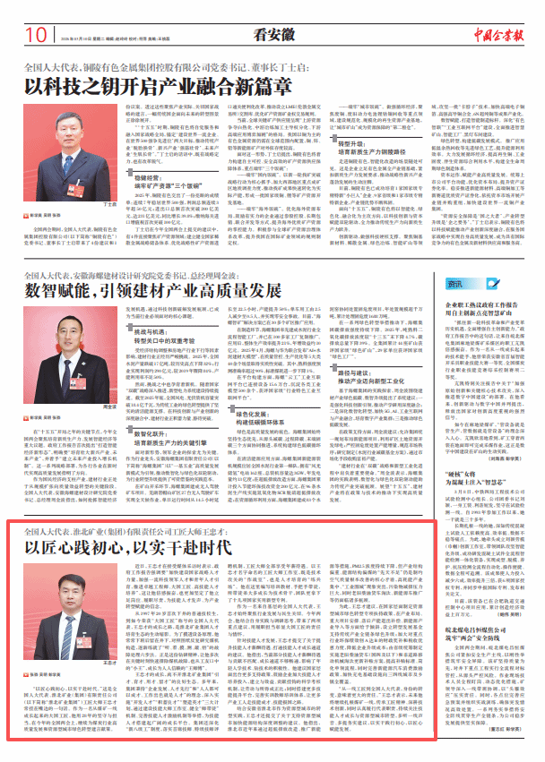 “站在一线,就要为一线发声。”王忠才说,机器轰鸣声里澎湃着的,是工友们对技能提升的渴望,是对企业高质量发展的期盼。他要做的,就是把这些声音整理好、带上会,用实际行动践行“人民选我当代表,我当代表为人民”的庄严承诺。(乔时庆)