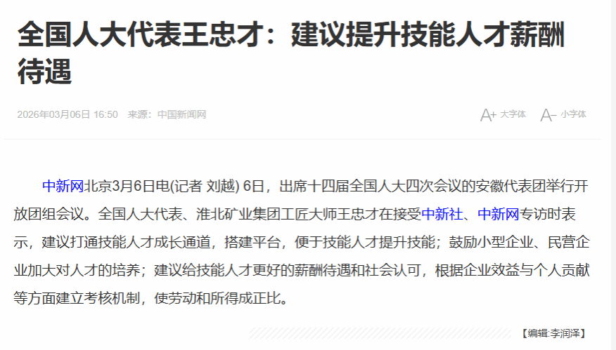针对技能人才发展,王忠才提交了关于提升技能人才薪酬待遇、打通技能人才成长通道的建议。他指出,当前部分技能人才薪酬待遇与贡献不匹配、成长通道不够畅通,影响了年轻人学技术、钻技术的积极性。他建议国家层面出台更多支持政策,鼓励企业加大技能人才培养投入,建立与效益、贡献挂钩的科学考核机制,让劳动与所得成正比;同时搭建更多技能提升平台,完善实训教师培训体系,让更多产业工人走技能成才、技能报国之路。