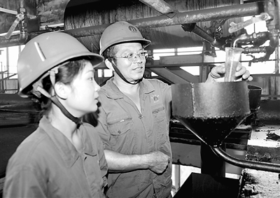 日前,安徽淮北矿业集团淮北选煤厂通过举办名师高徒大赛等活动,提升员工素质。图为选煤车间师徒两人在调试浮选设备用油比例。韩晓兵 摄