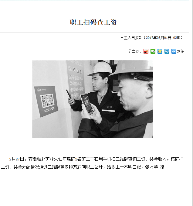 2017年2月27日,安徽淮北矿业朱仙庄煤矿综掘二区2名矿工正在单位会议室用手机扫二维码查询工资、奖金收入。该矿把职工工资、奖金分配情况通过公开栏、工资查询系统、二维码等多种方式向职工公开,给职工一本明白账。(张万学摄)