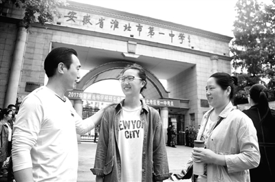 安徽淮北矿业集团杨柳矿提前1个月摸底,让58名职工回家陪子女参加高考,并如数支付其2天的工资。图为6月7日,高考第一天,该矿掘进一区职工孙金林(左)与妻子送女儿到考点。