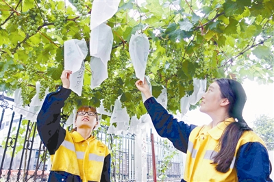 “车间小果园,绿色无公害,吃着真不赖!”安徽淮北矿业集团铁运处临涣机辆段检车员们利用休班时间在单位空地上种植了果树,目前小果园里的桃、杏已经成熟,可供食用。图为两名女职工在给葡萄套袋。