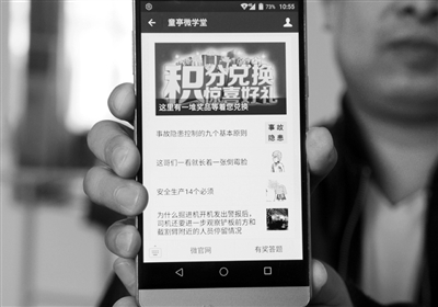 ▼近日,安徽淮北矿业集团童亭矿积极探索安全培训的新途径、新方法,在手机微信平台“童亭微学堂”内设立有奖答题环节,累积相应的积分就可以兑换相应的奖品,调动大家参加培训的积极性。