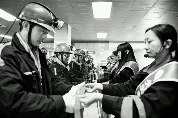 安徽淮北矿业集团孙疃煤矿充分发挥安全文化熏陶作用,开展了亲情家书、亲情微视频、“我的一次涉险经历”、全家福分享等活动,提醒职工时刻把安全记在心间。图为该矿协安员正在井口开展安全提醒活动。