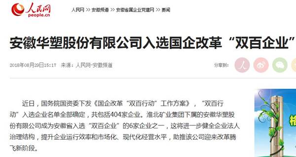 安徽华塑股份有限公司入选国企改革“双百企业”