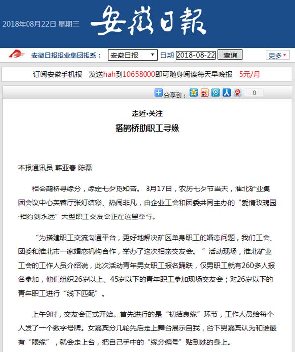 多年来,淮北矿业集团一直坚持“事业留人、环境留人、感情留人”的人才引进培养原则,多方关爱青年职工。企业工会早在2013年就组建了“矿区红娘”QQ群,注册矿区兼职“红娘”89人,定期发布单身男女相亲信息。5年来,企业工会先后发布单身青年信息600余条,于2010年、2011年和2017年成功举办了3届大型单身职工交友会,为500多人次的单身青年职工牵线搭桥,促成数十对青年职工走进婚姻殿堂。