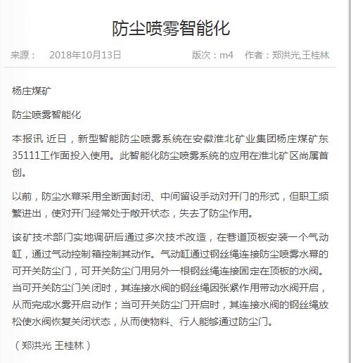 《中国煤炭报》:杨庄矿防尘喷雾智能化