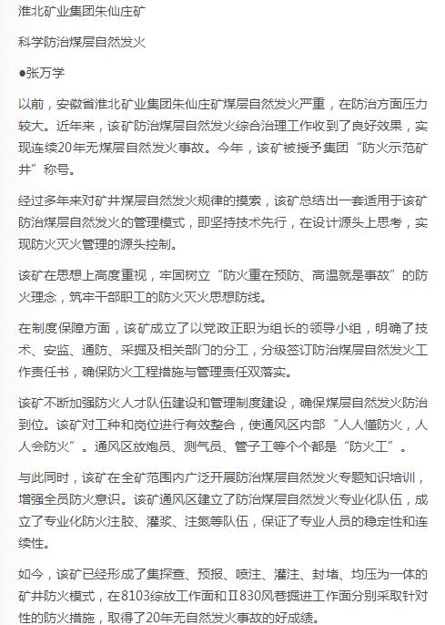 《中国煤炭报》:朱仙庄矿科学防治煤层自然发火