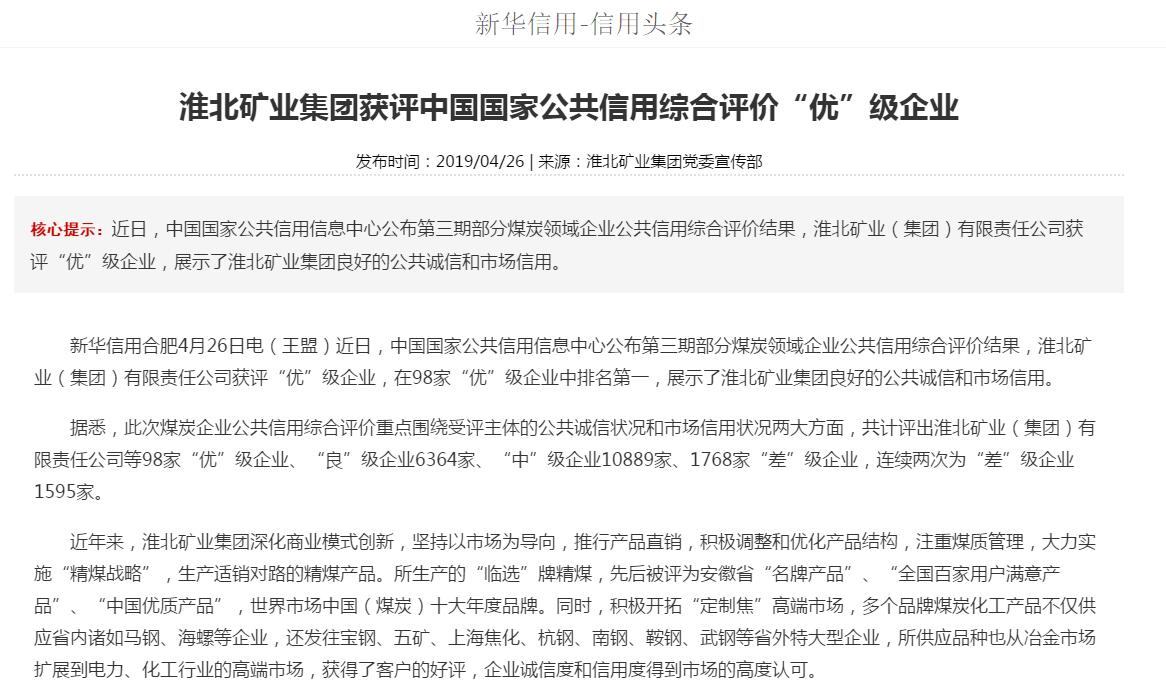 《新华网》:淮北矿业集团获评中国国家公共信用综合评价“优”级企业