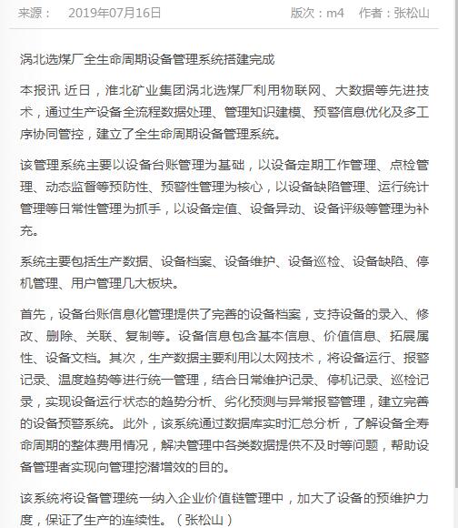 《中国煤炭报》:涡北选煤厂全生命周期设备管理系统搭建完成