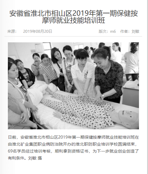 《中国煤炭报》:淮北矿业集团职防院开办保健按摩师就业技能培训班