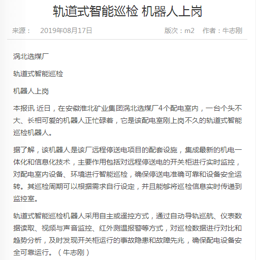 《中国煤炭报》:轨道式智能巡检 机器人上岗