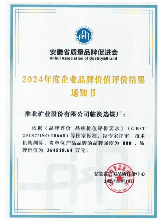 近日,在安徽省品牌促进会官网发布的2024年度安徽省企业品牌价值评价信息中,临涣选煤厂以“品牌强度880,品牌价值36.4亿元”摘得产品品牌类的桂冠。