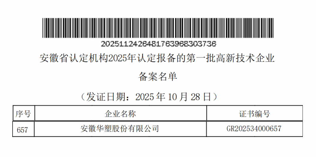 日前,安徽省2025年认定报备的第一批高新技术企业备案名单公示,华塑股份榜上有名。这是该公司自2016年以来第四次获得国家“高新技术企业”称号。